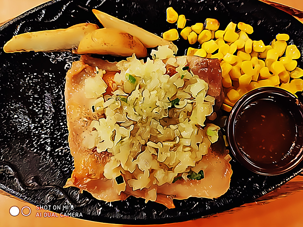 Pork steak with thick slice french fries, salad, and corn